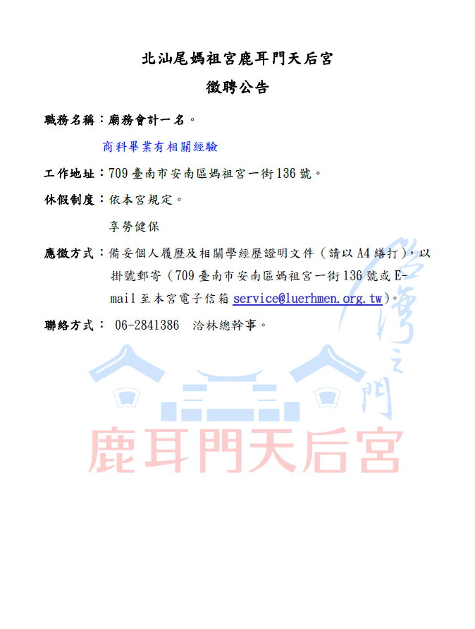 職務名稱:廟務會計一名。 商科畢業有相關經驗 工作地址:709臺南市安南區媽祖宮一街136號。 休假制度:依本宮規定。 享勞健保 應徵方式:備妥個人履歷及相關學經歷證明文件(請以A4繕打),以掛號郵寄(709臺南市安南區媽祖宮一街136號或E-mail至本宮電子信箱service@luerhmen.org.tw)。 聯絡方式: 06-2841386 洽林總幹事。